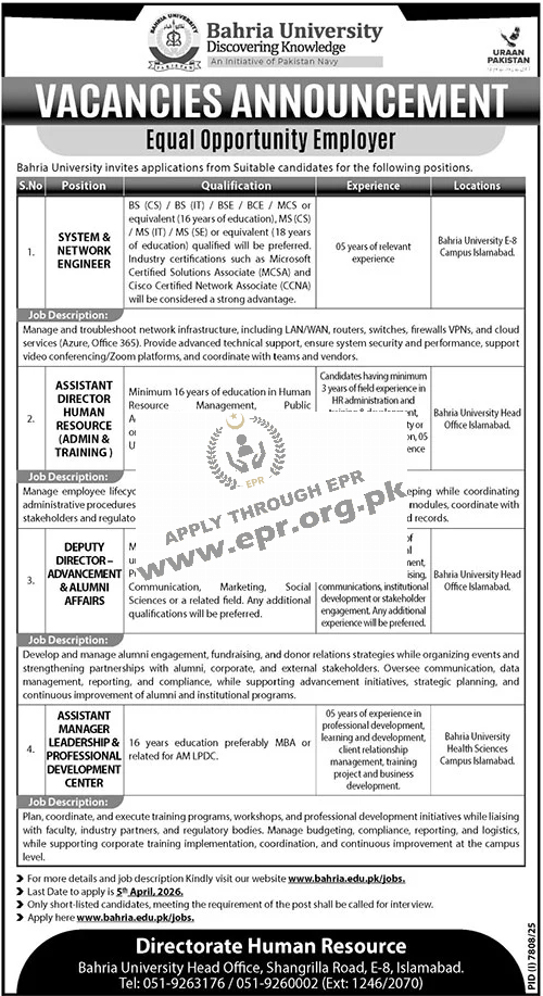 Minimum 16 years of education in Human Resource Management, Public Administration, Business Administration, or related field from HEC recognized University.