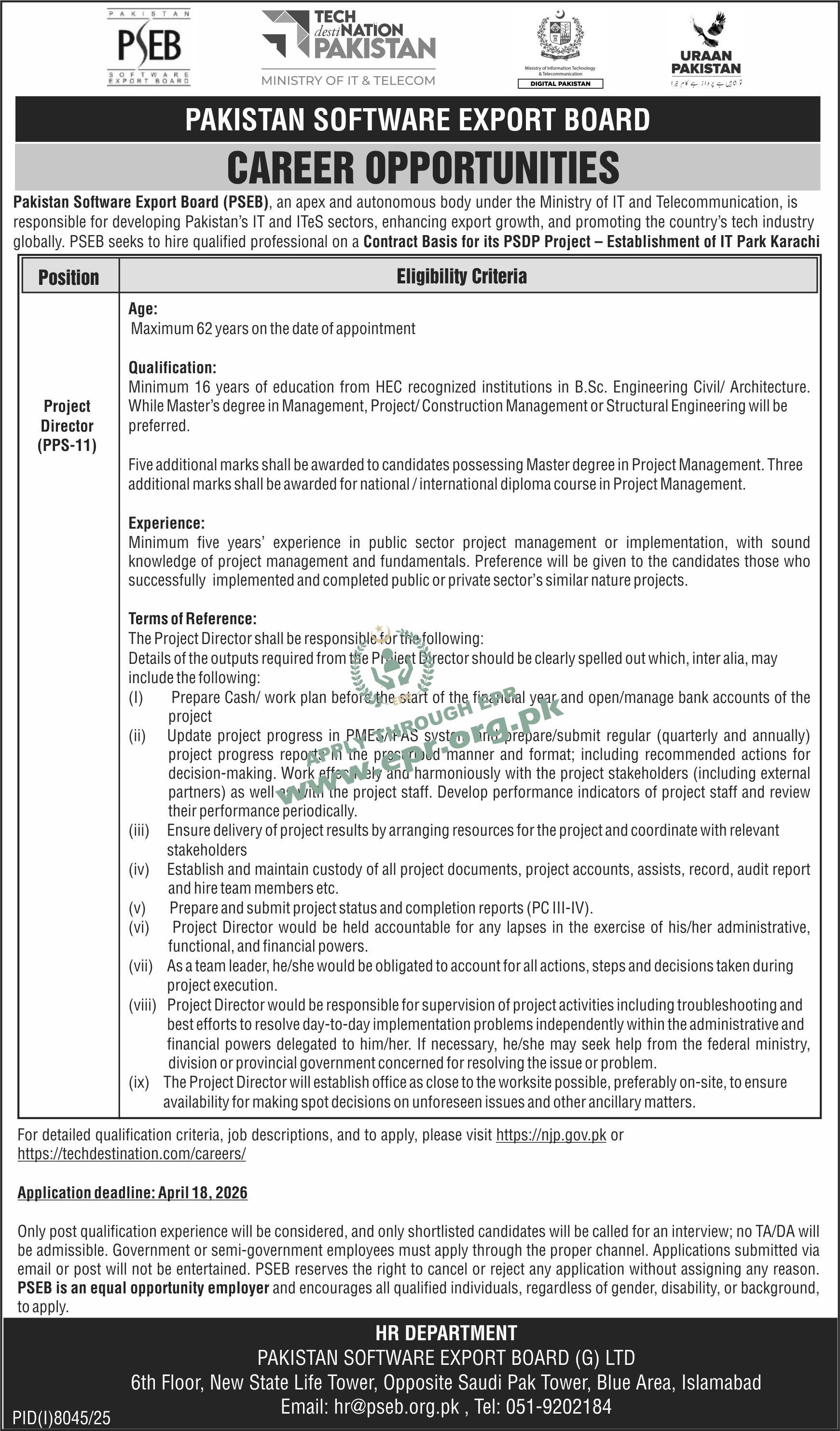 • Minimum 16 years of education from HEC recognized institutions in Project Management / B.Sc. Engineering / MBA / MPA / MBBS / MPH, Master or BS (4 years) degree in Economics or any other relevant field, depending upon the nature and requirement of the project.